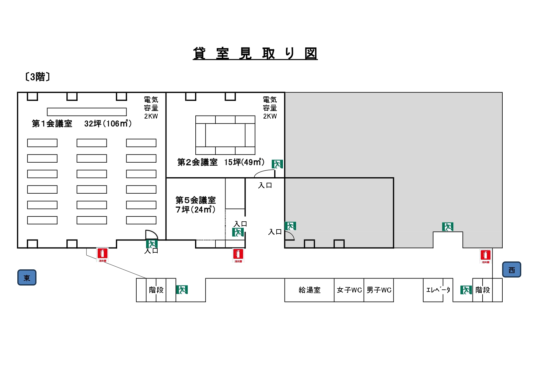 | 区 分 | 3階 | 地下 | 会議室名 | 第1会議室 | 第2会議室 | 第5会議室 | 多目的室 | 面積(㎡/坪) | 106.86/32 | 48.89/15 | 24/7 | 132/40 | 収容人員 | 60人 | 24人 | 8人 | 20〜50人 |